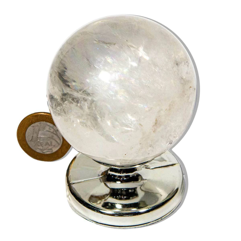 Transforme seu ambiente e suas práticas espirituais com esta esfera de cristal de quartzo natural com reflexos Arco-Íris, uma peça lapidada à mão, 100% autêntica e única. Ideal para uso esotérico, meditação, limpeza energética e decoração de alta vibração.