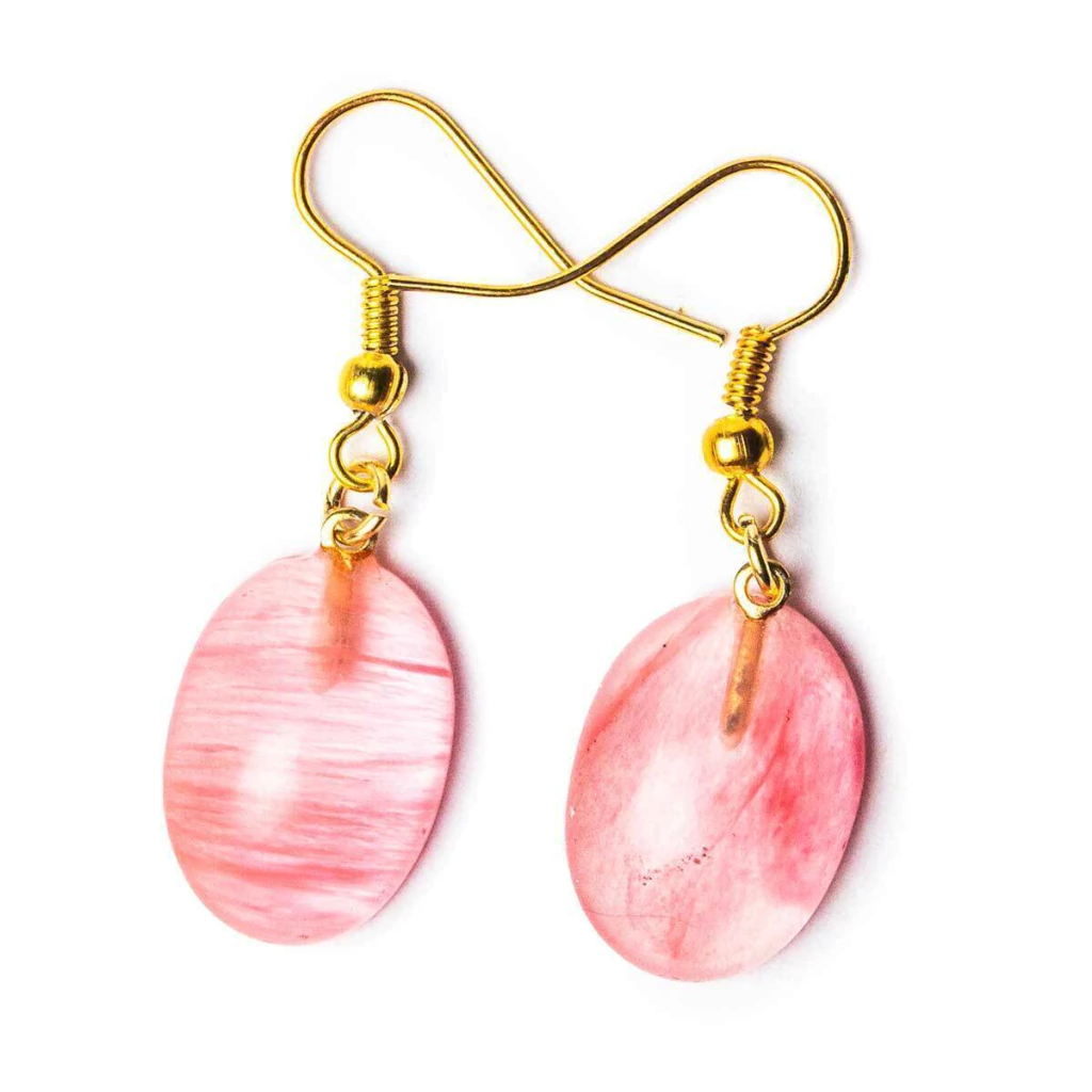 Brinco Cabochão Oval Pedra Cherry, furado com pino e anzol com banho em dourado totalmente artesanal. A montagem é dourado. Pedra faz parte Familia da Obsidiana.