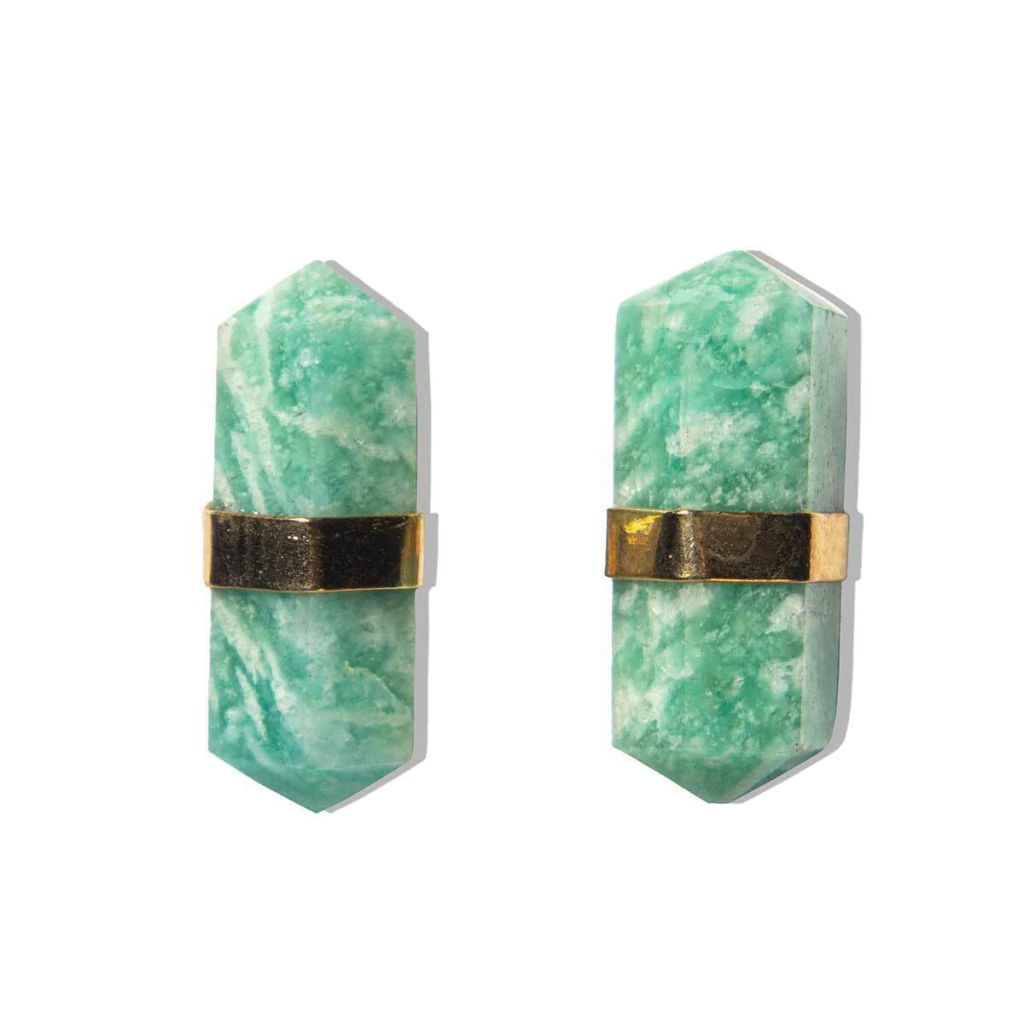Brinco Micro Bi Ponta Envolto com Amazonita Natural - Acabamento Dourado