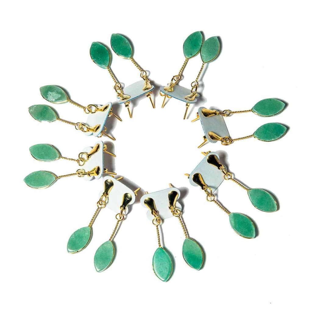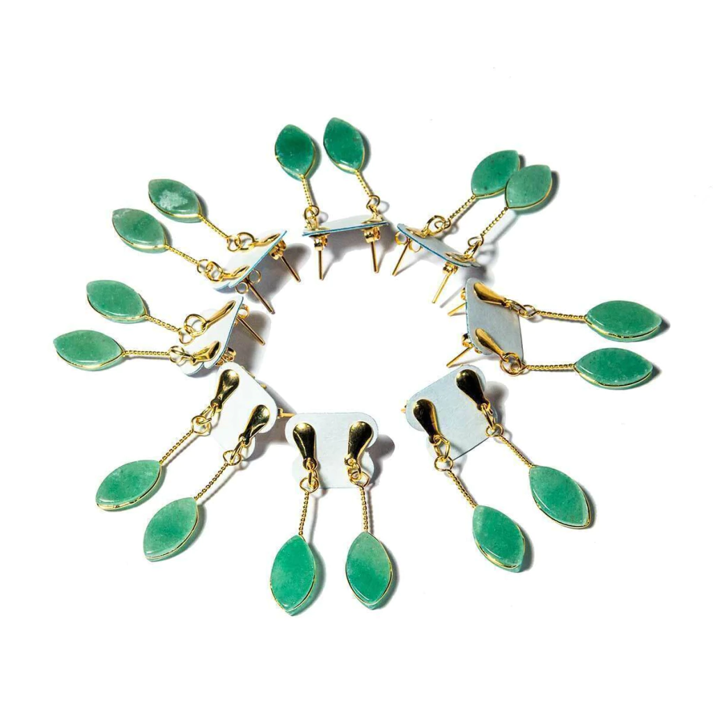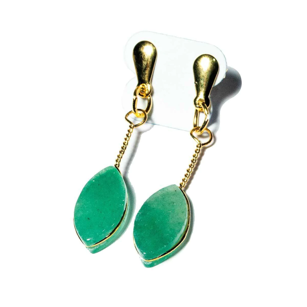 Brinco com Pedra Quartzo Verde Lapidado – Corte Navete e Acabamento Folha – Montagem Artesanal em Flash Dourado
