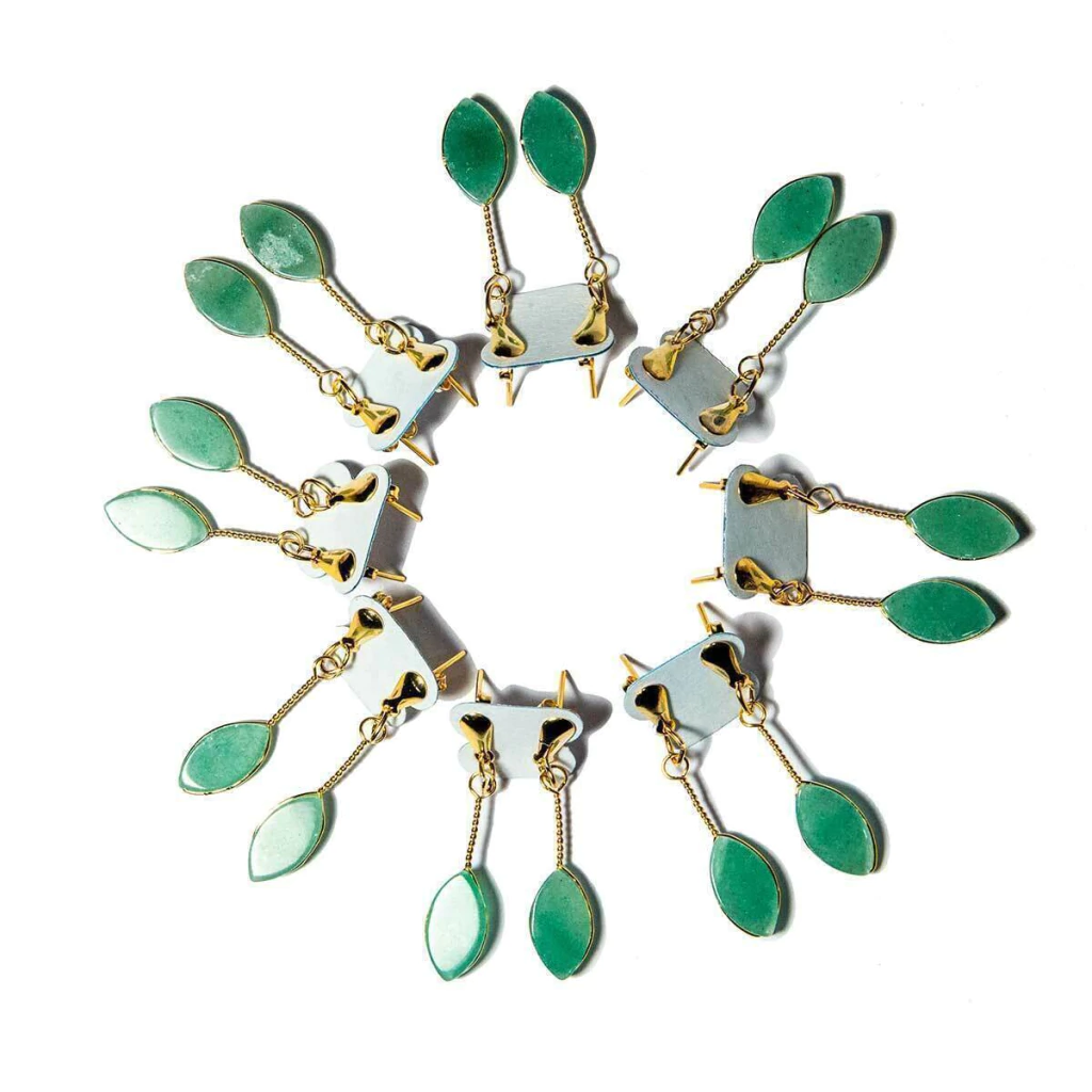 Brinco elegante e sofisticado com pedra natural de Quartzo Verde, cuidadosamente lapidada à mão no corte Navete. A montagem artesanal com acabamento em formato de folha, pino e tarracha em metal niquelado com flash dourado, garante charme e leveza à peça.