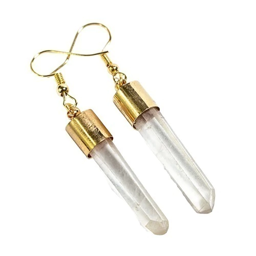 Brinco artesanal com ponta de Cristal Laser bruto, sem lapidação, preservando sua forma natural. A peça é montada com caixinha metálica e argola com anzol, ambos com acabamento dourado. Ideal para quem busca um visual autêntico com pedras naturais.