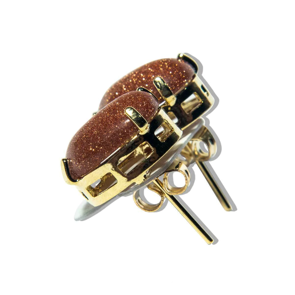 Brinco de Pedra do Sol Lapidado Cabochão Oval com Pino e Tarracha Dourado