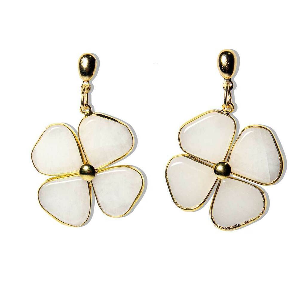 Brinco Trevinho da Sorte, Pedra Quartzo Leitoso Montagem totalmente artesanal. A montagem é feita banho flash dourado