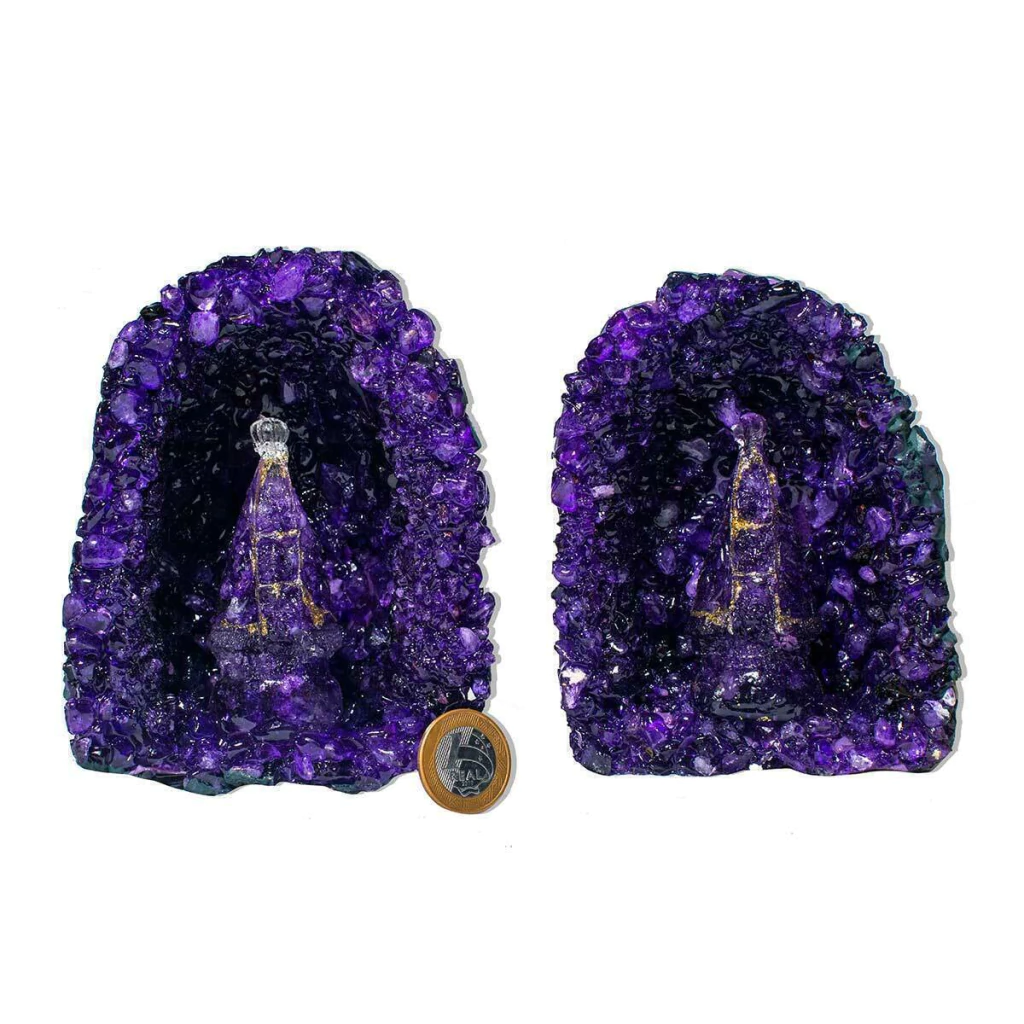 Peça devocional e energética com cristais de Ametista Extra e imagem de Nossa Senhora Aparecida – Ideal para fé, proteção espiritual e decoração.