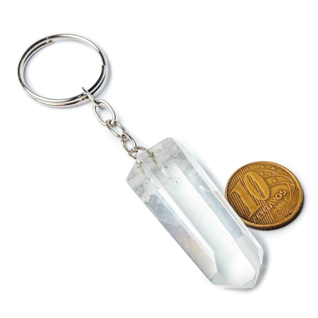 Chaveiro com cristal natural, cristal gerador sextavado, chaveiro de quartzo transparente, pedra natural lapidada, acessório com cristal de rocha, chaveiro artesanal com pedra, cristal de canalização de energia