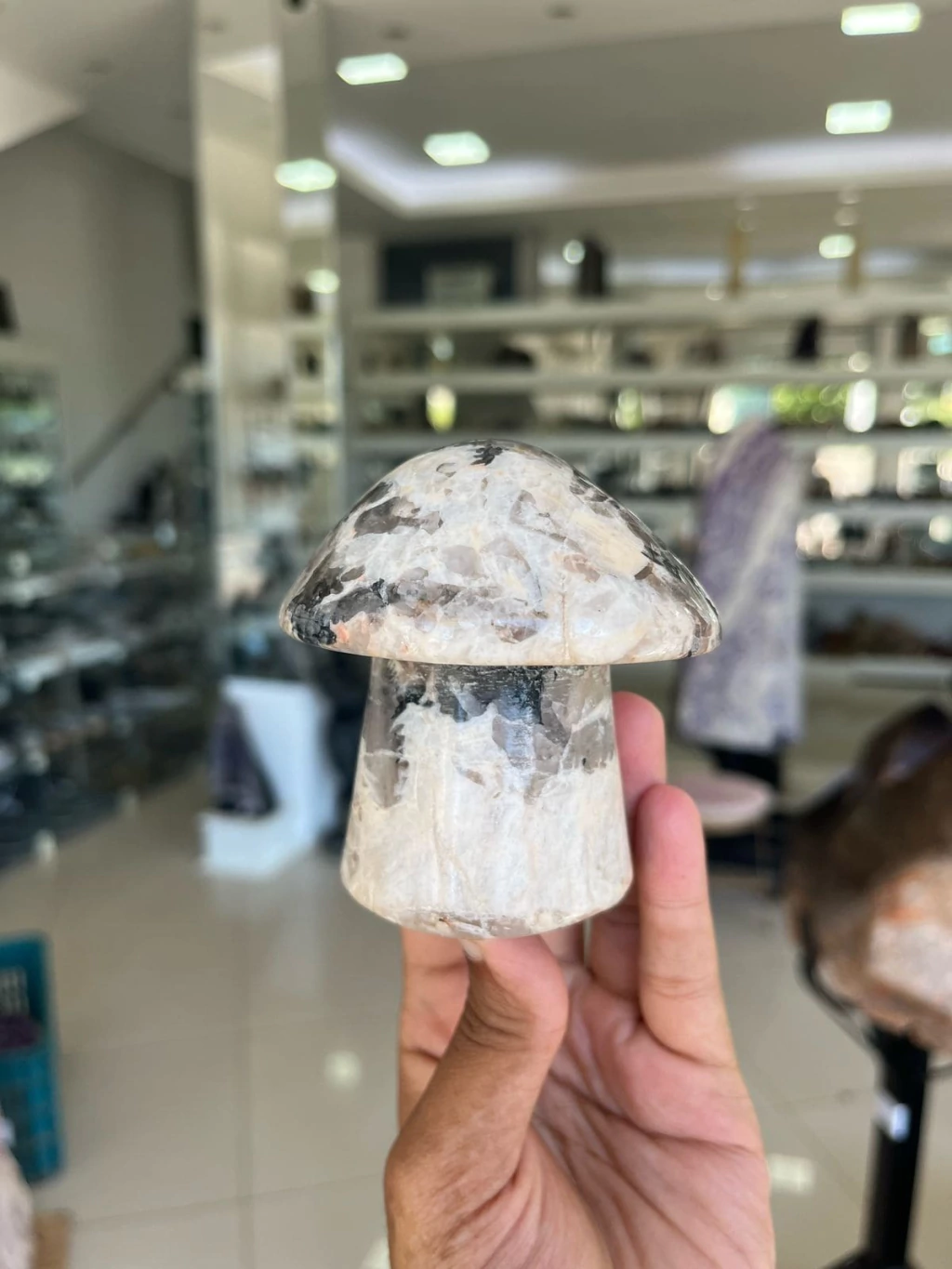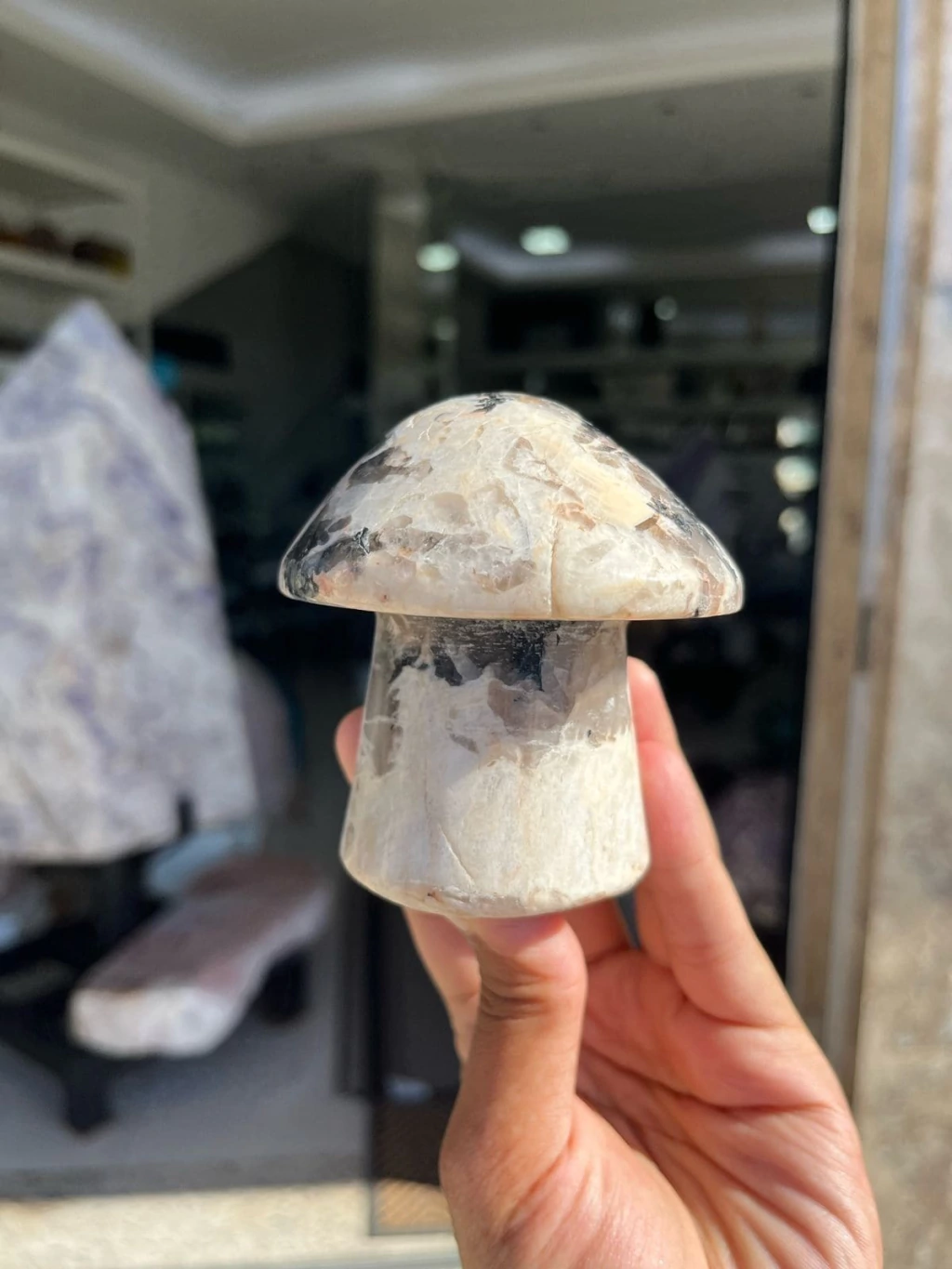 Cogumelo Pedra Turmalina no Feldspato Bege Natural, Ornamento muito bem trabalhado com Detalhe realista Feito por um artesão muito Qualificado, Material Muito delicado e Minimalista Demanda Cuidado ao manuseio