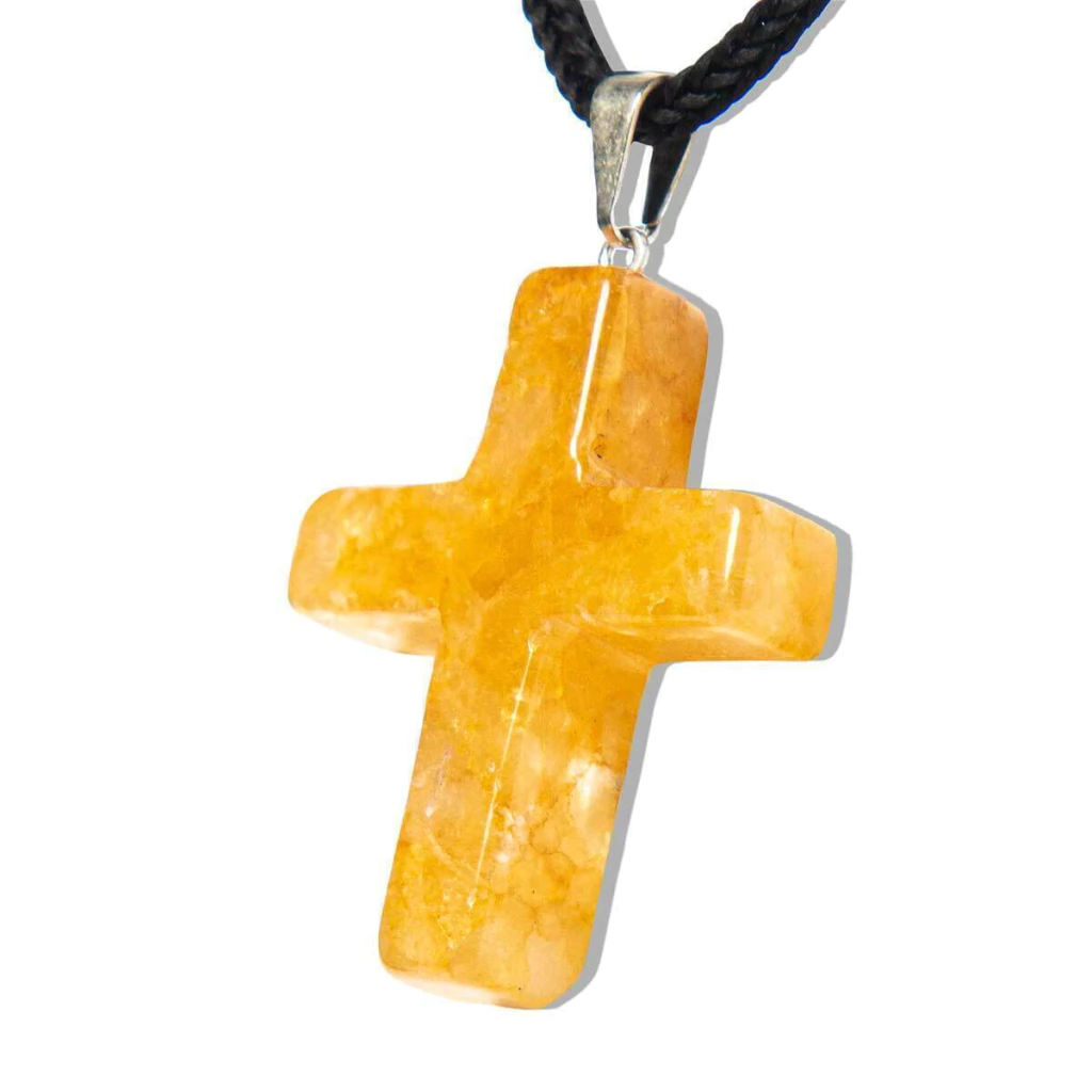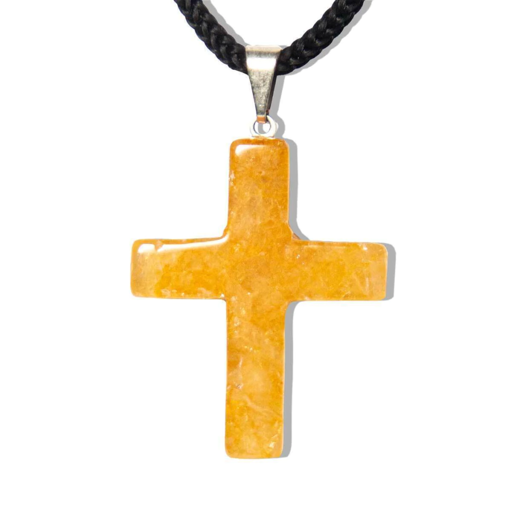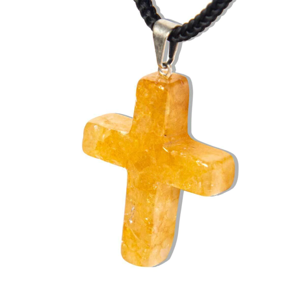 Este colar de crucifixo em pedra citrino é uma peça elegante e protetora, que transmite força. Use como amuleto para afastar a negatividade.
