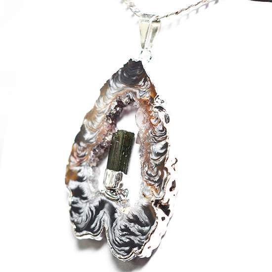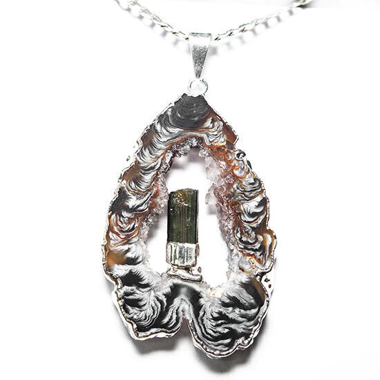 Pingente Chapa Geodo e Canudo de Turmalina Preta Especial Pedra Agata Natural Montagem Envolto com perinha para passar o cordão Pedra Genuina com origem garimpo lapidação e montagem manual