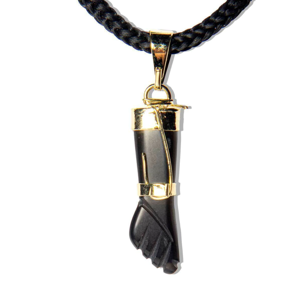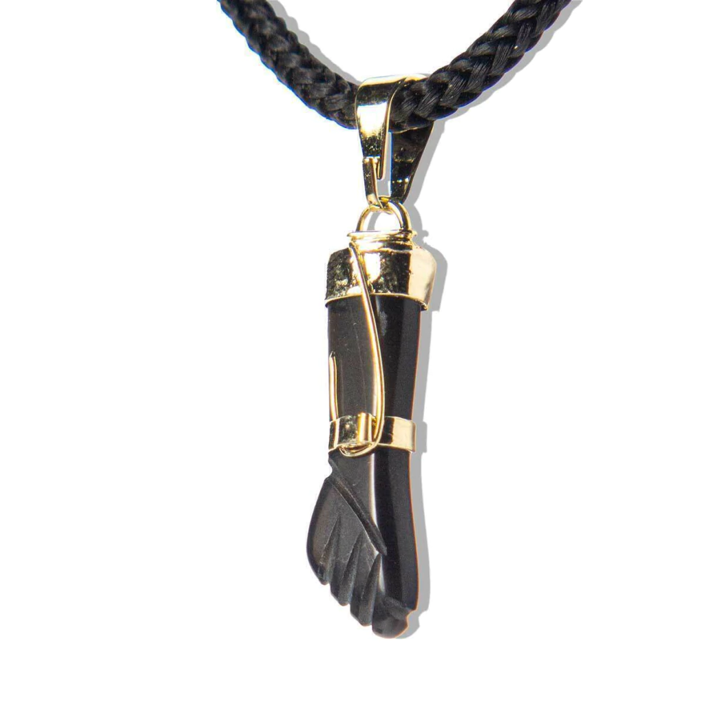 Pingente Amuleto Figa Onix Preto, lapidação totalmente artesanal com polimento vibrado, montagem envolto dourado. Lapidação suave.