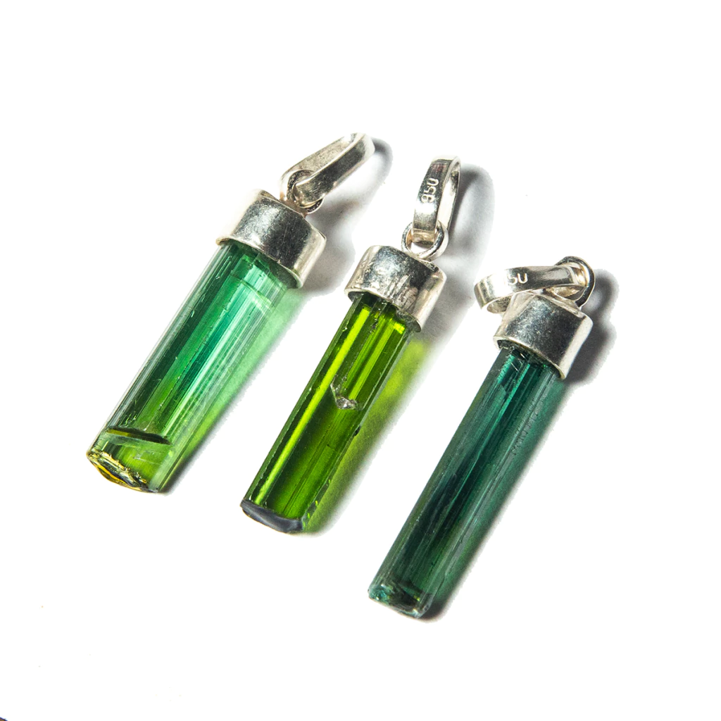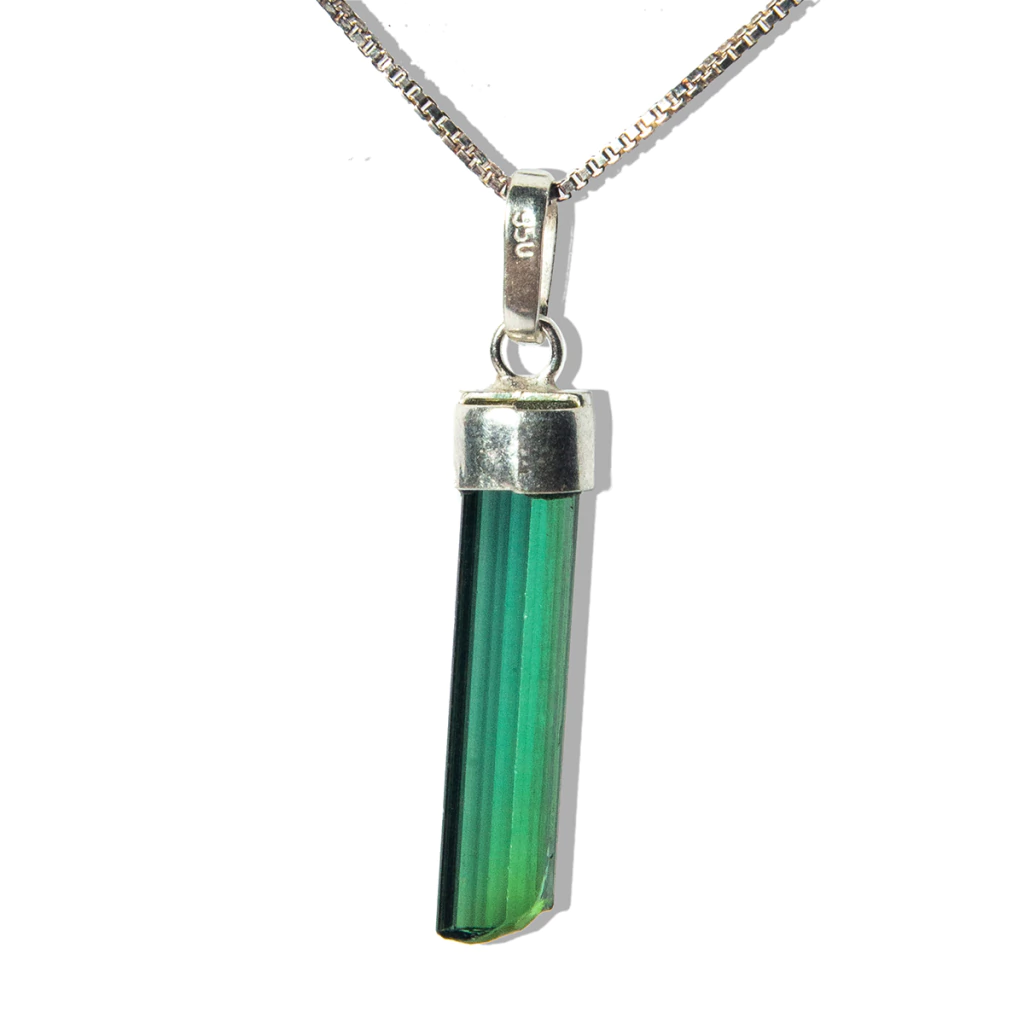 Colar feito com Turmalina Verde Natural no formato de canudo bruto, montado artesanalmente com Prata 950. Uma joia elegante e autêntica, ideal para quem valoriza acessórios com pedras naturais e acabamento de qualidade.