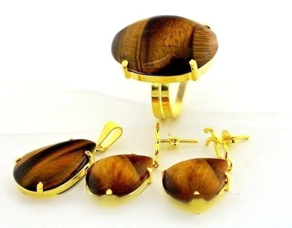 Conjunto Anel Cabochão Oval, Brinco Gota e Pingente Gota Pedra Olho de Tigre Natural, totalmente artesanal. A montagem é feita Garra banho flash dourado