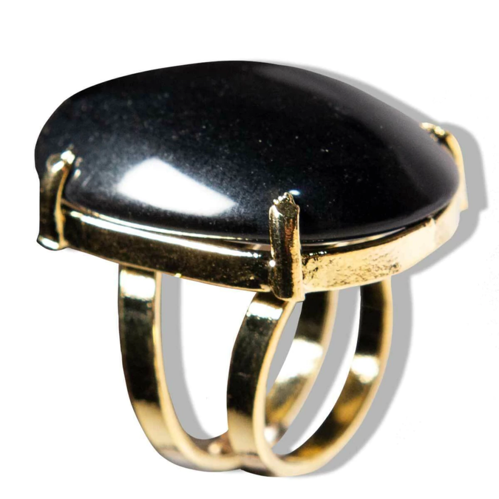 Conjunto Anel Cabochão Oval, Brinco Gota e Pingente Gota Pedra Onix Preto, totalmente artesanal, a montagem é feita Garra banho flash dourado