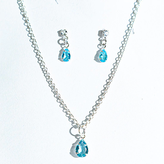 Conjunto de brinco e colar com zircônia azul na prata 925, perfeito para dar um toque de elegância e sofisticação ao seu look. Adquira já!