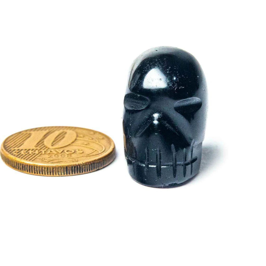 Crânio esculpido em pedra obsidiana negra, um amuleto de proteção e equilíbrio para quem busca um estilo misterioso, autêntico e sofisticado.