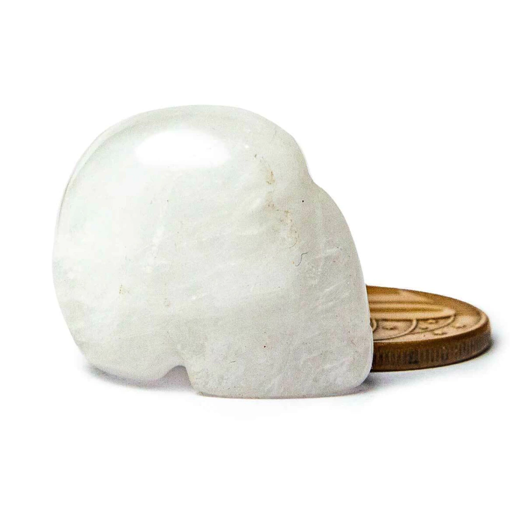 Crânio esculpido em pedra quartzo leitoso, uma escolha suave, elegante e cheia de personalidade para quem busca um visual sofisticado.