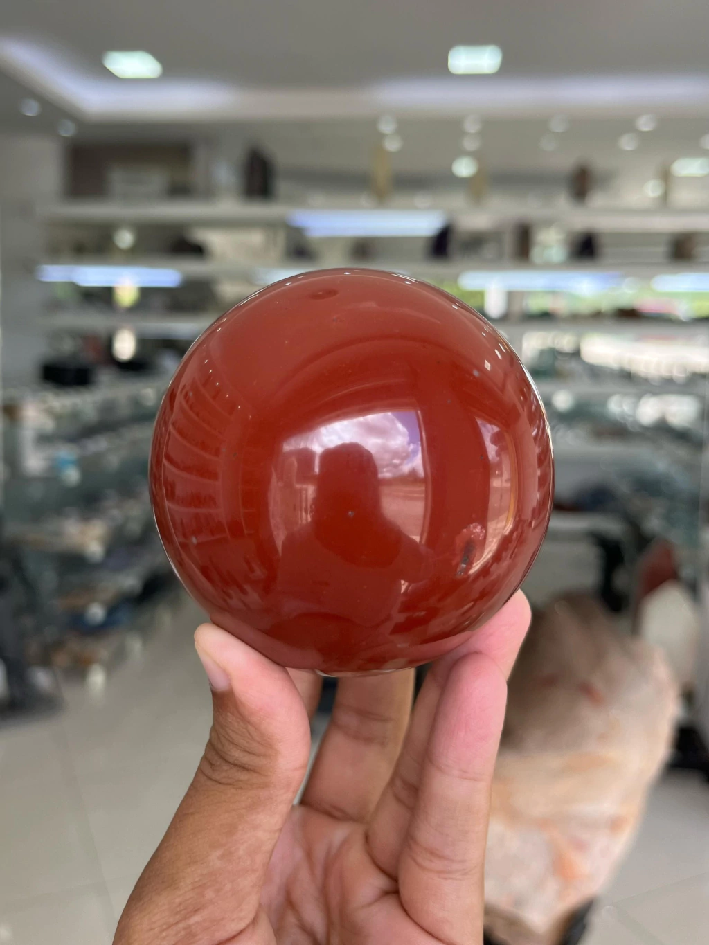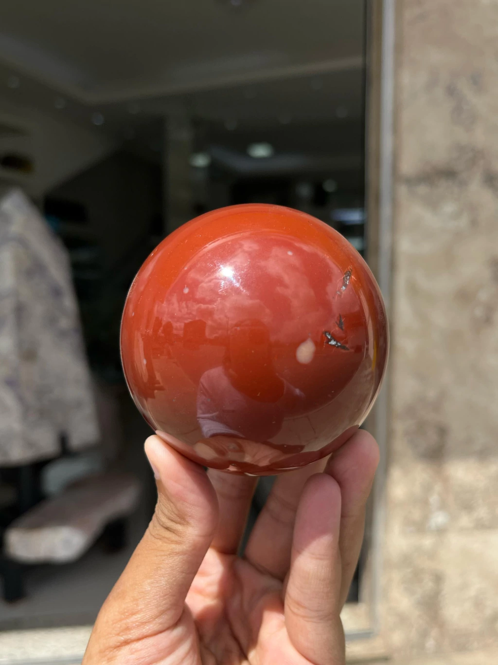 Bola de Jaspe Vermelho com lapidação artesanal manual, pedra natural com bom brilho, mineral autêntico Jaspe Vermelho. Suas cores vibrantes variam entre tons de vermelho intenso e laranja terroso, proporcionando uma aparência única e envolvente. A pedra é lapidada manualmente, sem ser retificada, preservando suas qualidades naturais. Devido à sua dureza e materiais incrustados, podem ocorrer pequenas imperfeições, mas essas características são normais e não afetam as propriedades energéticas da pedra.