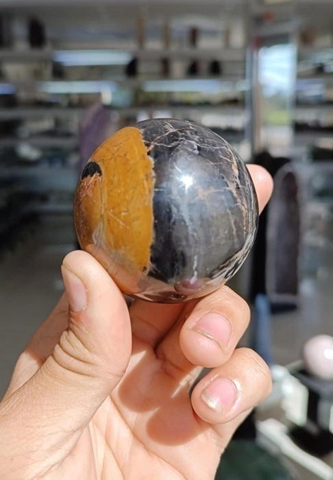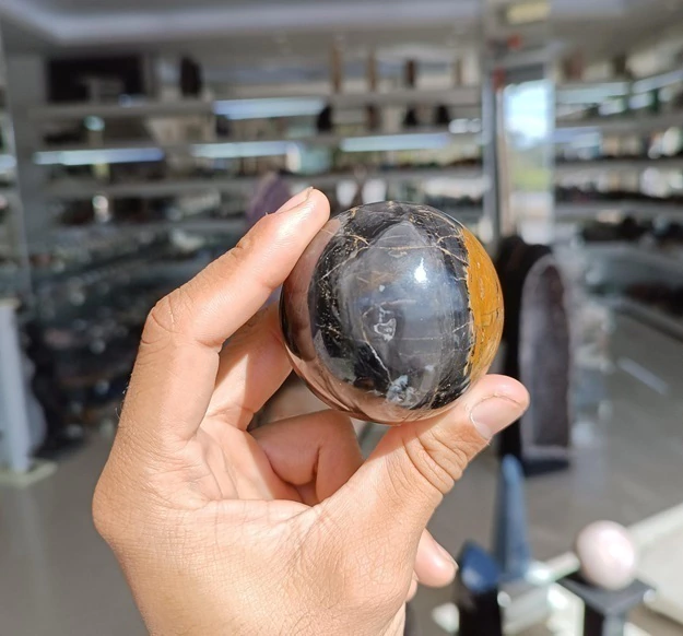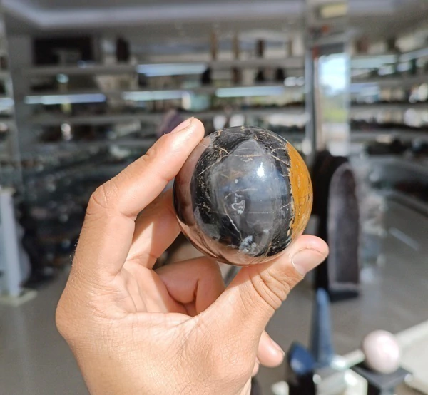 Bola de Onix Preto com lapidação artesanal manual, pedra natural com bom brilho, mineral autêntico Onix Preto As cores mesclado de amarelo/marrom são provenientes da pedra mãe calcedonia ,a esfera não é retificado é lapidada manualmente Devido sua dureza e materiais incrustados tem correçôes mas nada que interfira no Onix