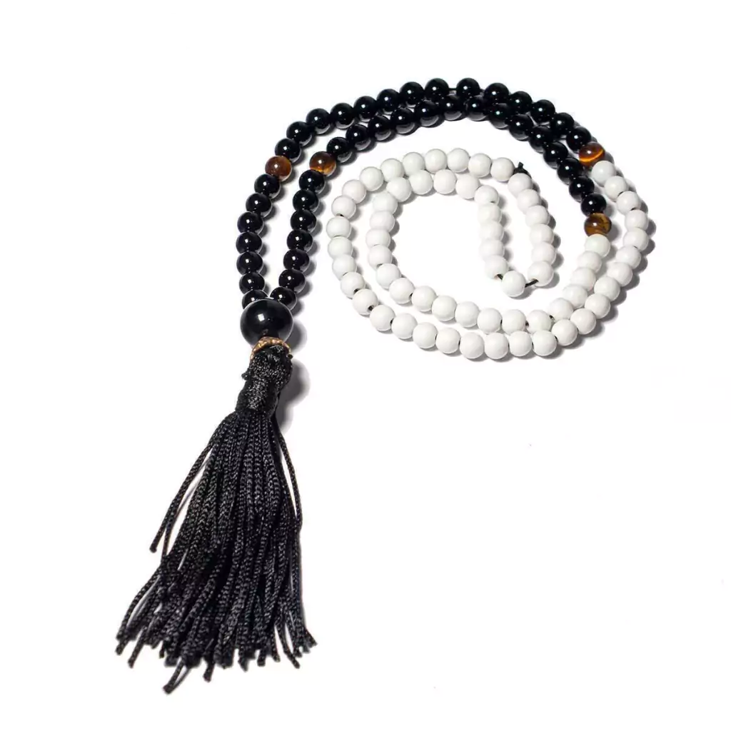 Japamala 108 Contas Feito na Pedra Obsidiana Negra e Bolinhas de Policarbonato Branco Louça e 4 Divisoria Olho de Tigre Dando um designer moderno no terço, Bolinhas com Furo Longitudional furos MANUAIS ao meio da pedra, furos bem centrais, o fio é uma Linha Multifilamento, Bolinha Obsidiana Negra 12mm e Tassel Finalizando o acabamento