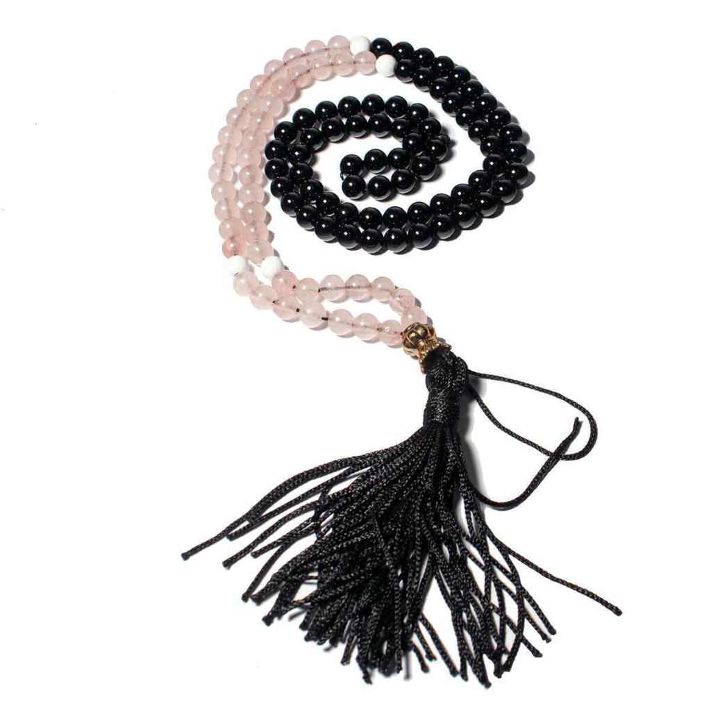 Terço Japamala 108 Contas Feito na Pedra Quartzo Rosa e Obsidiana Negra e Bolinhas de Policarbonato Branca Dando um designer moderno no terço, Bolinhas com Furo Longitudional furos MANUAIS ao meio da pedra, furos bem centrais, o fio é uma Linha Multifilamento, acabamento dourado e Tassel Finalizando o terço