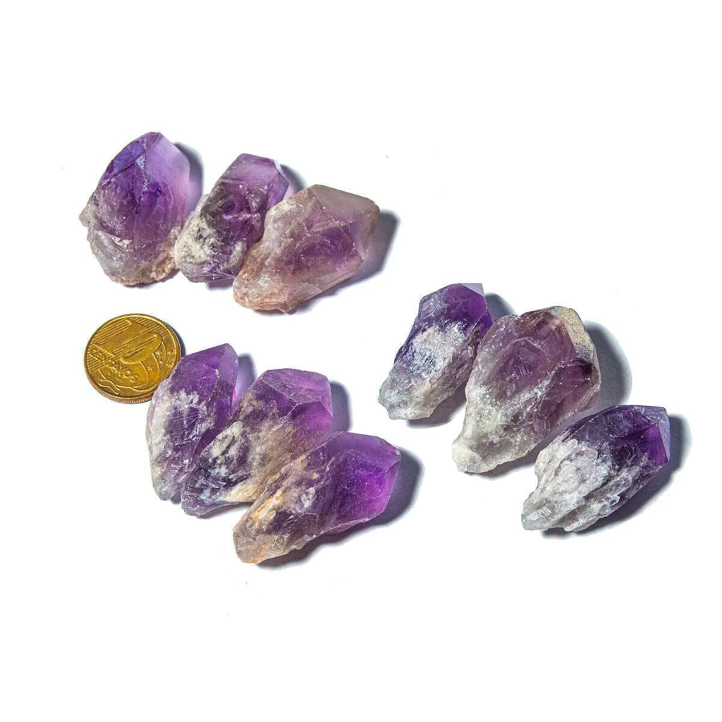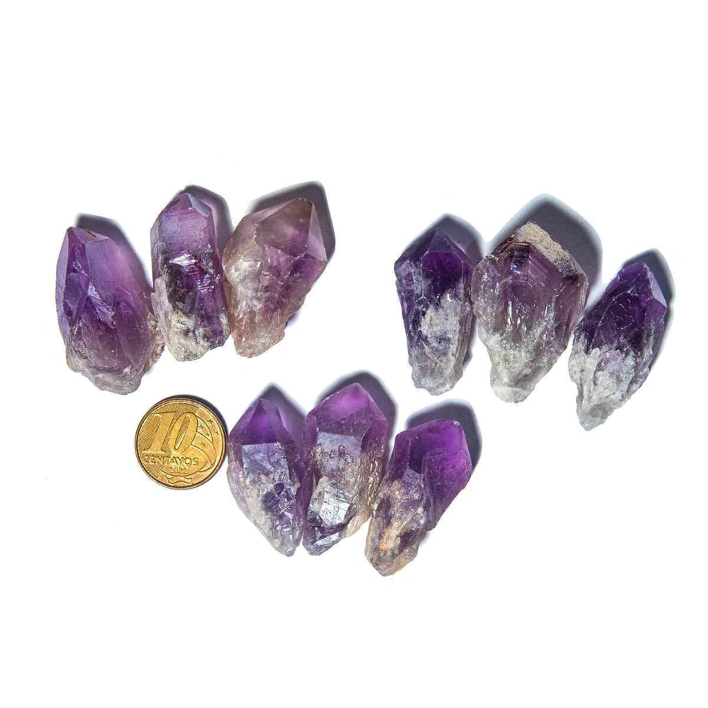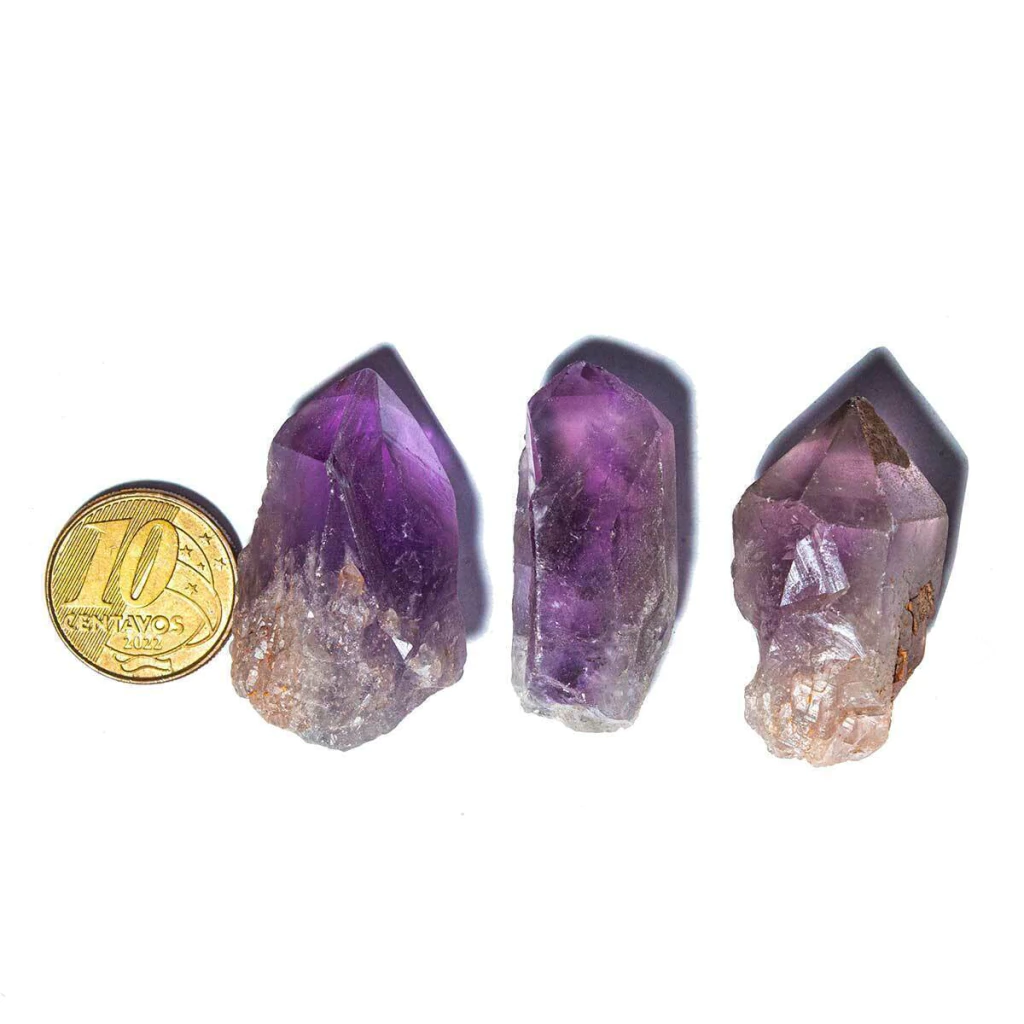 As pontas têm base serrada para facilitar o apoio em superfícies planas, e embora apresentem tonalidade mais clara e menor intensidade de roxo, mantêm a beleza e a energia características da Ametista. As peças podem apresentar transparência parcial e estruturas internas naturais, como inclusões, veios ou microfissuras típicas de pedras autênticas de garimpo.