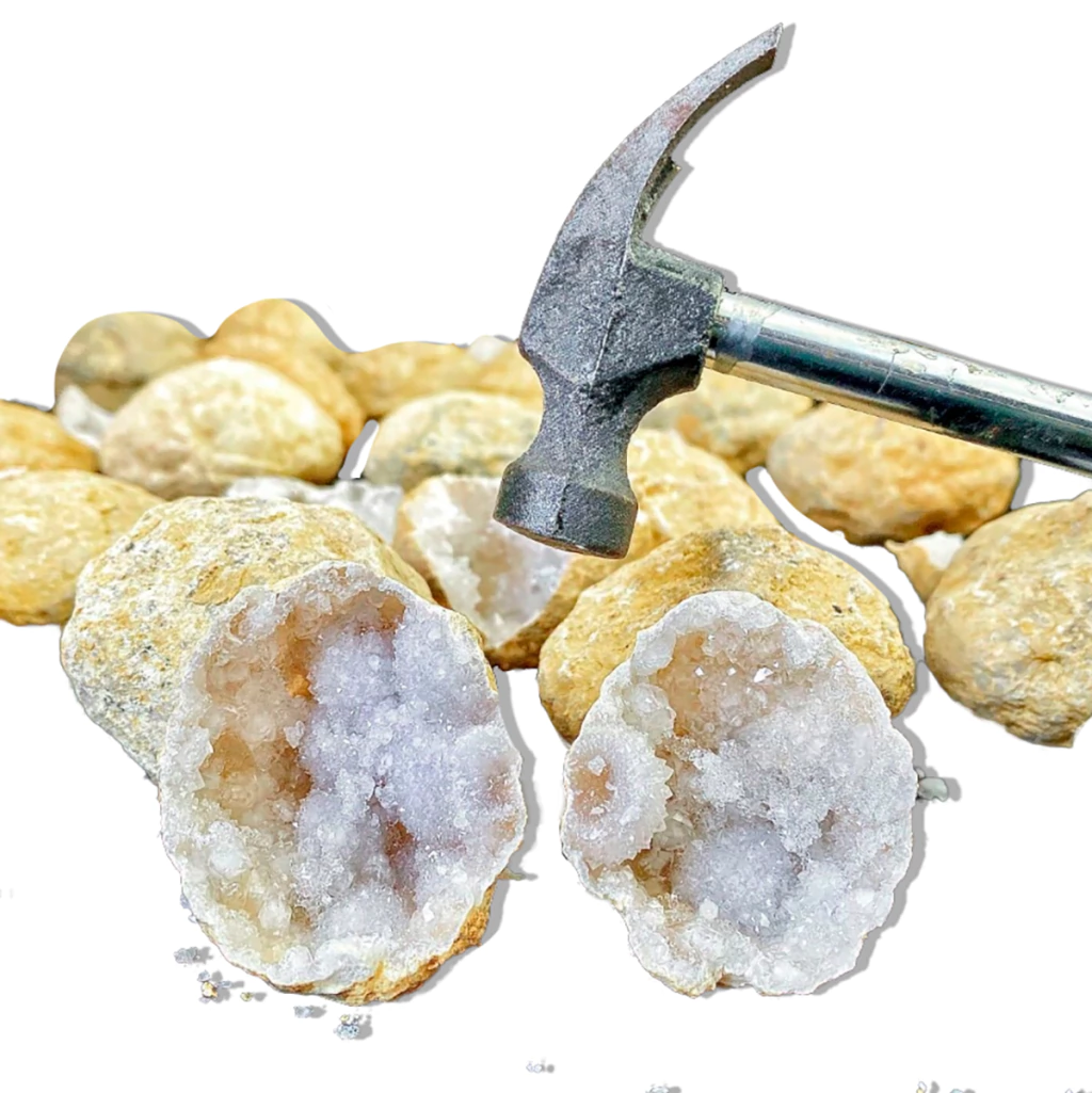 Use um pano, luvas e um martelinho ou formão para quebrar seu geodo com segurança. O momento da abertura é único — e vale a pena filmar ou registrar!