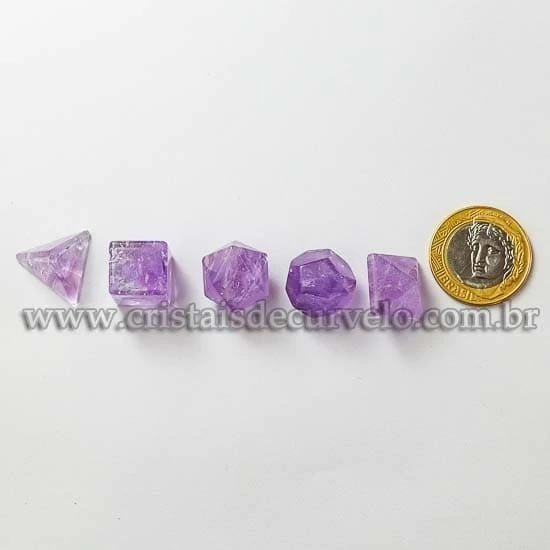 Kit solido de platão formas geometricas lapidado em pedra natural de garimpo com boa qualidade, Tetraedro, Hexaedro, Octaedro, Dodecaedro, Icosaedro ideal para coleção, estudo, presente etc Solidos de Pedra Ametista Lapidação Manual