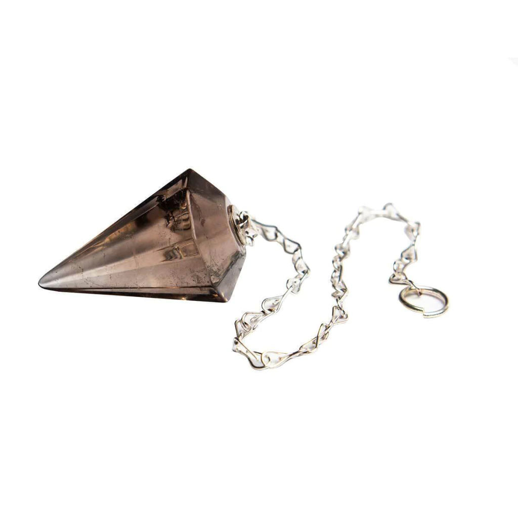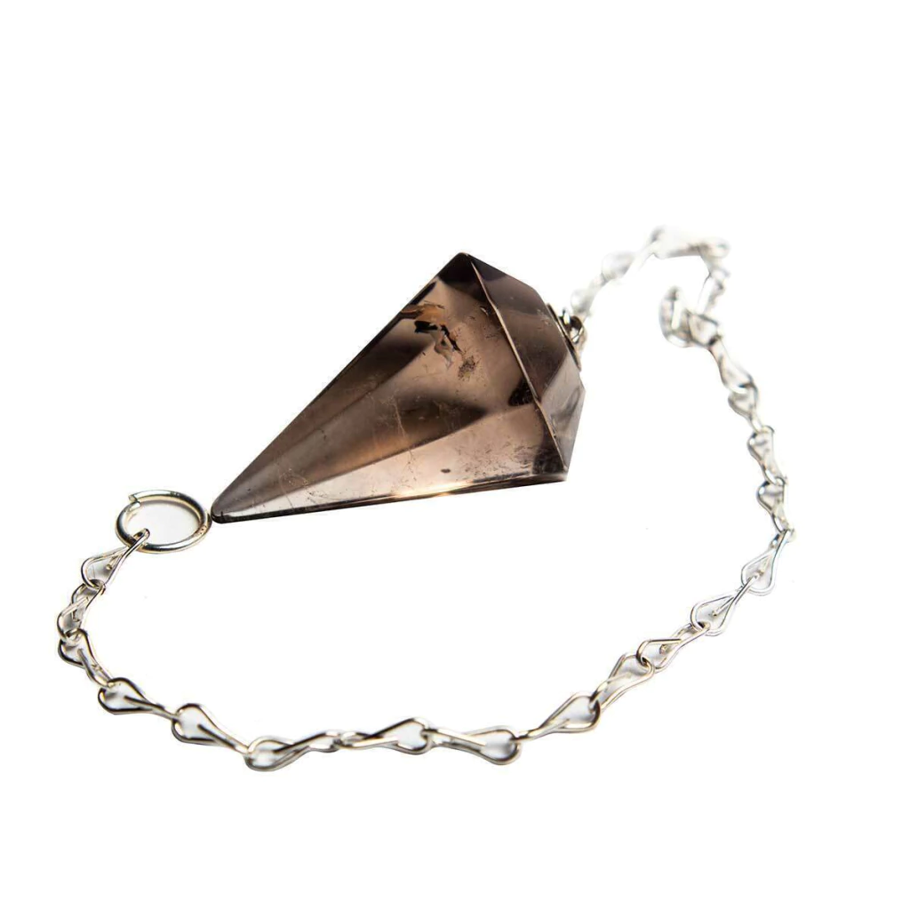 Este pêndulo é fabricado em Quartzo Fumê, uma pedra natural lapidada manualmente com a técnica de lapidação pião facetado, disponível em 8 ou 12 facetas (conforme disponibilidade de estoque). Cada peça é cuidadosamente plastificada e montada com tulipa colada, acompanhada de um presente especial: uma corrente de metal banhada a prata.