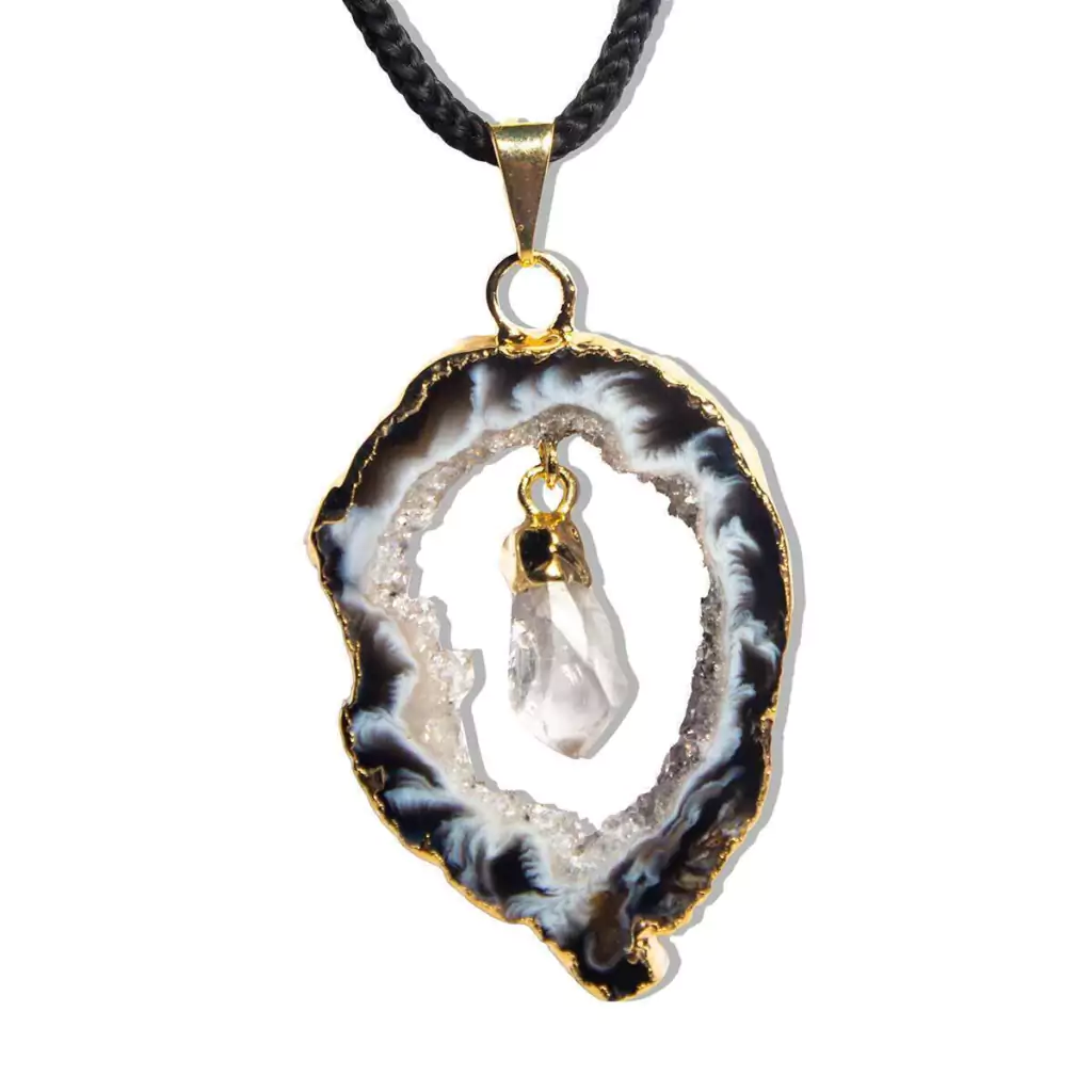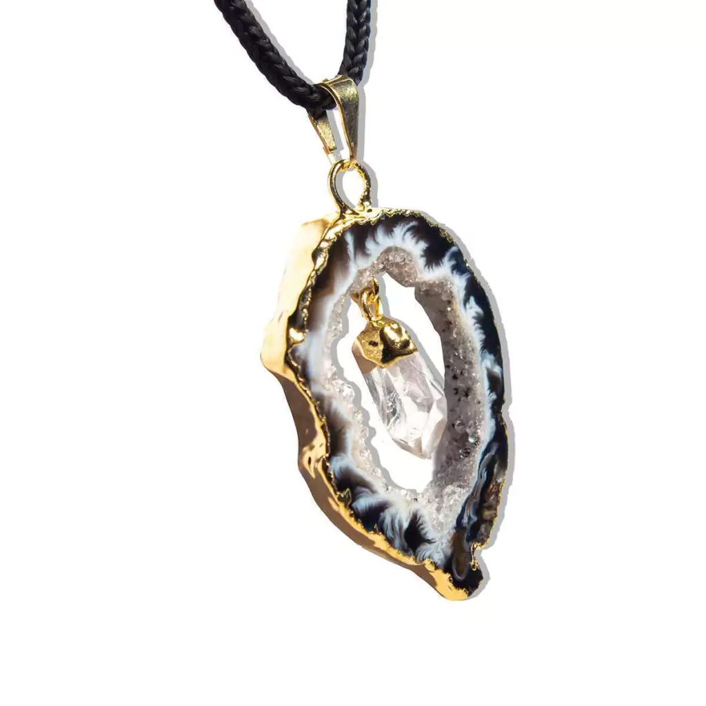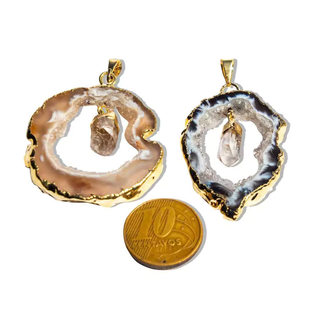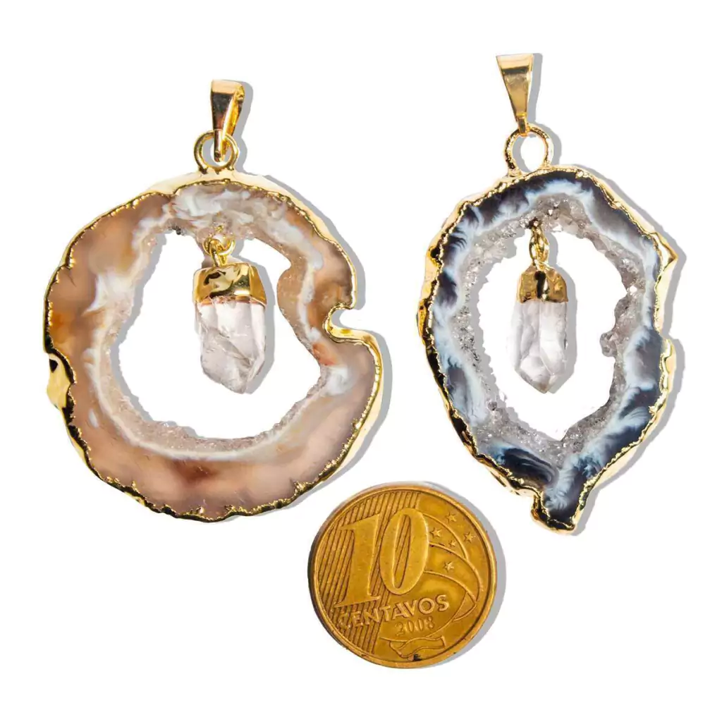 Transforme seu estilo com o charme e a energia deste Pingente de Chapa de Geodo com Ponta Móvel em Cristal Natural. Uma peça única, perfeita para quem valoriza a força da natureza e a elegância artesanal.
