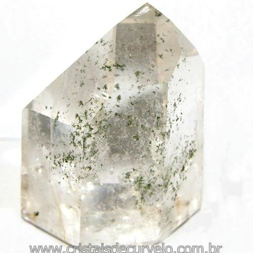 Ponta Cristal Lapidado Clorita Mineral, pigmento esverdeado "Lodolita Verde" incrustado em fragmentos na Pedra Cristal Quartzo transparente como Inclusões Flutuando no quartzo .Popularmente chamado de Lodo verde ,amostra pra colecionador .Pedra Natural de garimpo .