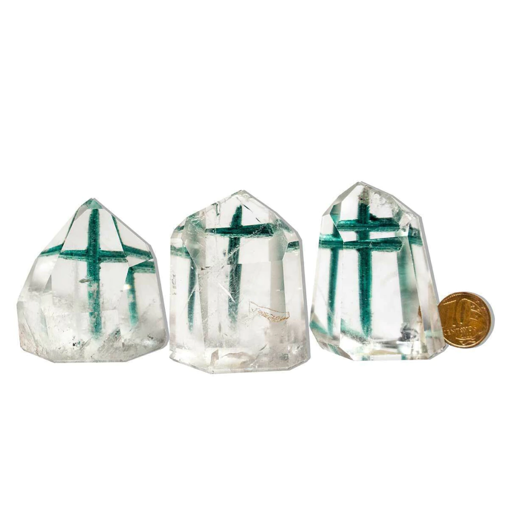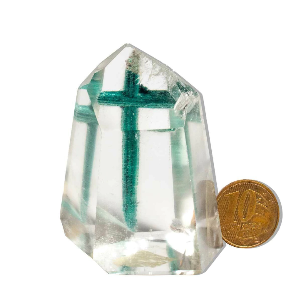 Ponta de Quartzo Cristal Transparente com Cruz Artificial - Pedra Natural de Alta Qualidade para Decoração e Harmonização de Ambientes