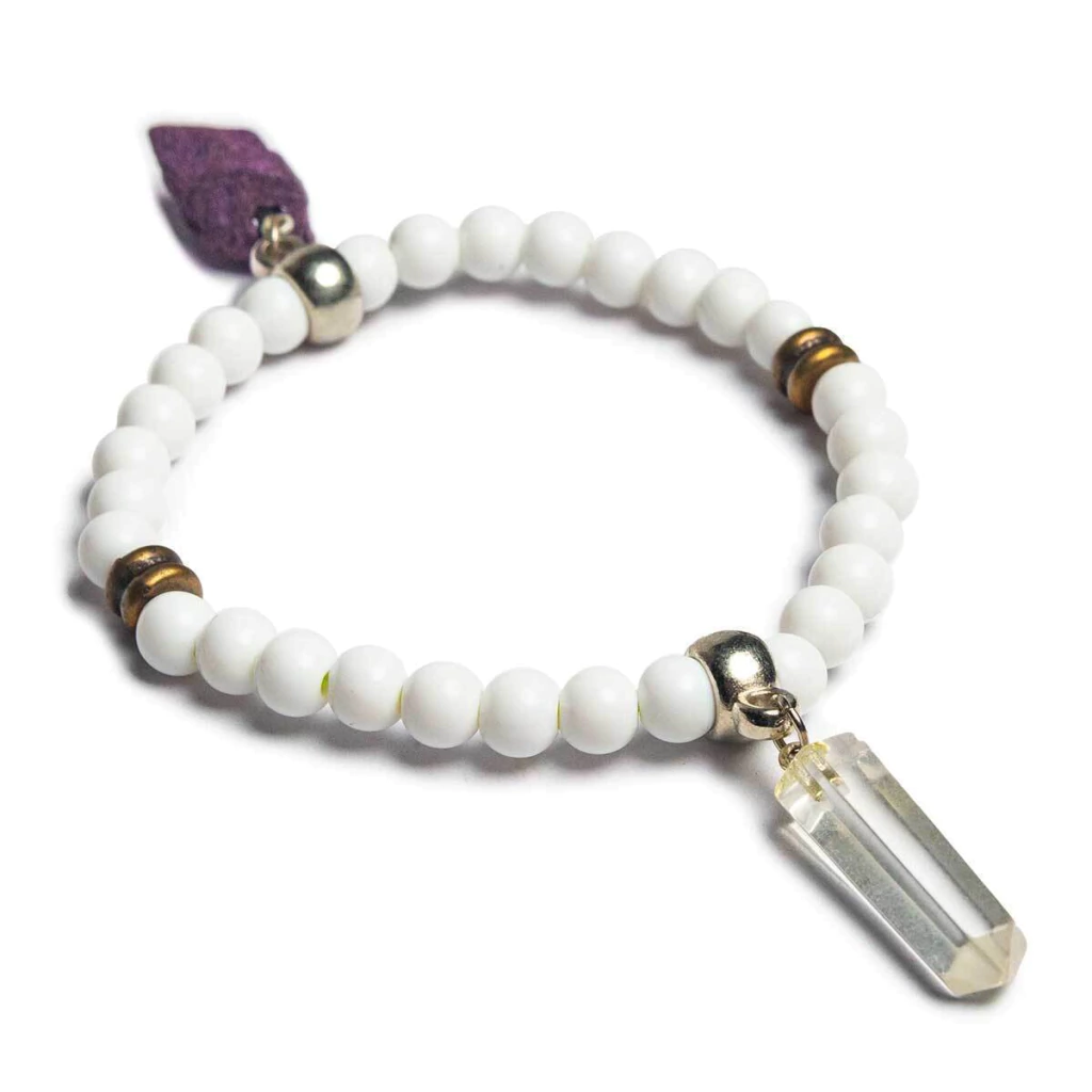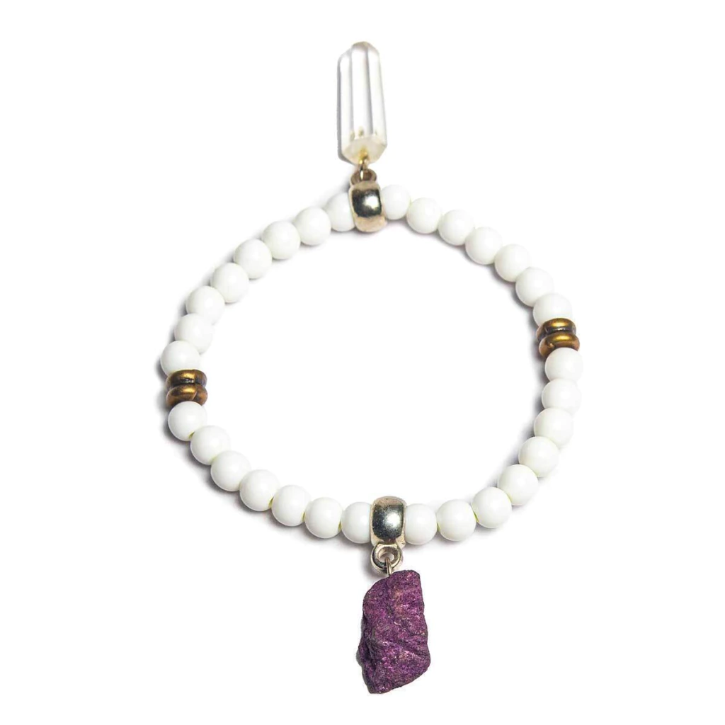 Contém Uma Pulseira Nlux com Purpurita de verdade (100% Natural) com uma delicada pontinha de cristal no lado oposto à purpurita, miçangas Brancas e metal estiloso em contato com a Purpurita.