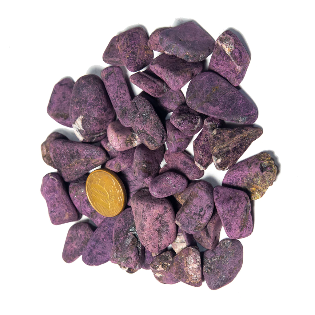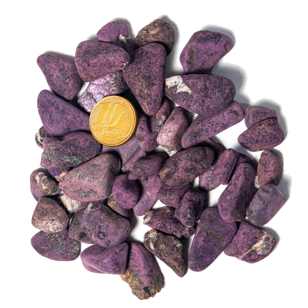 Purpurita - Eficaz para proteção psíquica, a Purpurita estimula a iluminação. Do ponto de vista espiritual, ela abre os chakras da coroa superiores e os liga ao da base, estimulando a evolução sem impedimentos, ancorando a mudança energética resultante na realidade funcional.